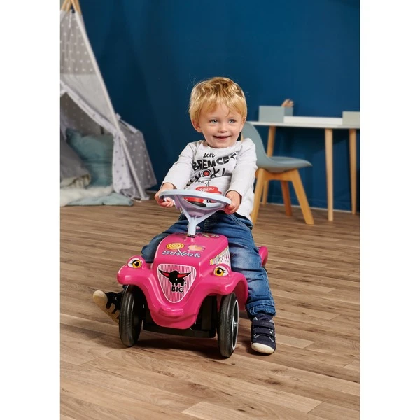 Fröhliches Himbeerpink und ein freches, witziges Süßigkeiten-Design in Trendfarben laden Kinder ab 12 Monaten zu Ausflügen draußen und drinnen ein. Doch nicht nur im Hinblick auf Design und Extras überzeugt das Fahrzeug aus der Bobby-Car-Linie. Das BIG-Bobby-Car Classic ist legendär in seiner Form und unschlagbar in Sachen Qualität. Die seit Jahrzehnten bewährte, unveränderte Karosserie des beliebten Kinderautos ist ergonomisch perfekt auf die Bedürfnisse der kleinen Fahrer und Fahrerinnen abgestimmt. Ein griffiges Sicherheitslenkrad mit mechanischer Hupe, vier robuste und abriebfeste Kunststoffräder, je eine Anhängerkupplung vorne und hinten sowie eine Kniemulde zum Fahren für größere Kinder ergänzen die spielstarke Ausstattung. Für einen kleinen Wendekreis sorgt die stufenlose Achsschenkellenkung des BIG-Bobby-Car. Die hervorragende Verarbeitungsqualität und der tiefliegende Schwerpunkt machen das BIG-Bobby-Car zum besonders sicheren Spielzeug.
