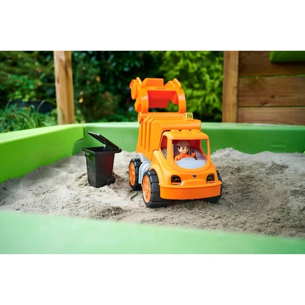 | Inhalt/Ausstattung | Müllwagen mit kippbarer Ladevorrichtung, Reifen aus weicherem Kunststoff und geschlechtsneutraler Spielfigur | ||