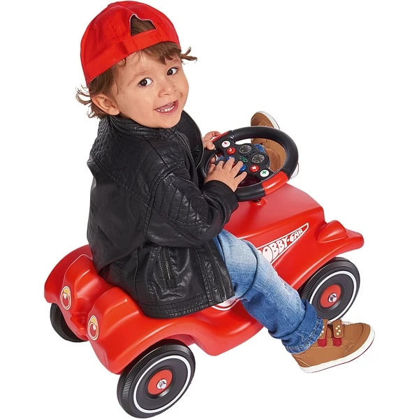 | Weitere Informationen | Das BIG-Racing-Sound-Wheel passt auf alle BIG-Bobby-Car (New und Classic) ab Baujahr 2010. Für ältere Modelle gibt es die Option, über den BIG-Ersatzteilservice eine passende Lenkstange nachzubestellen! Bitte das Bobby-Car mit montiertem Lenkrad nach Spielende drinnen verstauen, da das Lenkrad durch die enthaltenen Soundmodule nur Spritzwassergeschützt ist. 3 x 1,5 V AAA, LR3 werden benötigt! | ||