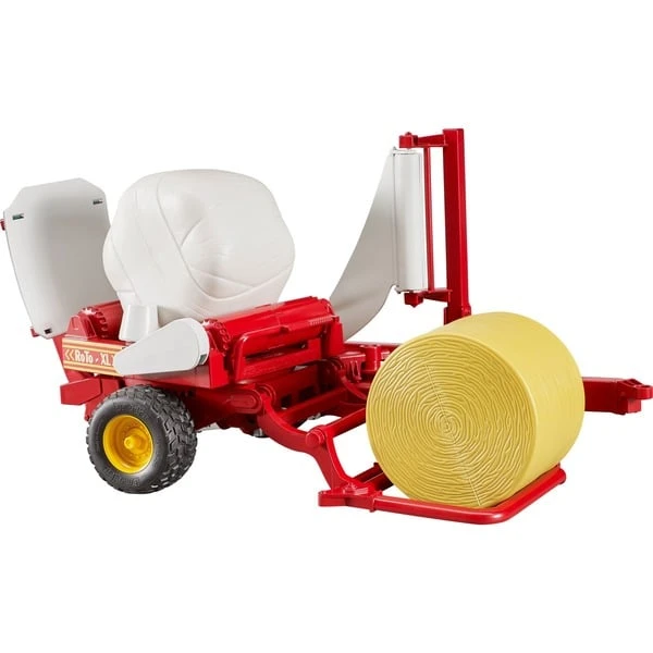 Der Ballen wird über die Beladewippe vorne auf den Drehteller gehoben. Nach dem Absenken der Beladewippe wird der, während des Fahrbetriebs selbsttätig drehende Drehteller, aktiviert und so der Wickelvorgang simuliert. Beim Wickelvorgang wird der aufgeladene Rundballen mit Hilfe des rotierenden Aufbaus um seine Hochachse und zugleich mittels der angetriebenen Drehwalzen um die Axialachse gedreht. Danach wird der Ballen über die Abkippvorrichtung auf die bewegliche Ablagewippe gekippt. Ein ockerbrauner und ein weißer Rundballen sind im Lieferumfang enthalten. Die Zugdeichselposition kann nach Gebrauch eingestellt werden und Profilreifen runden das Bild ab.Art.-Nr.: 1233212
