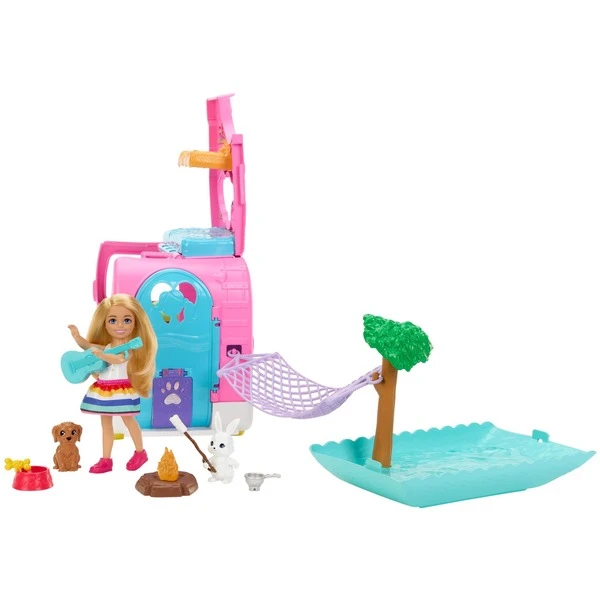Mit dem Barbie Chelsea 2-in-1 Camper geht es auf große Entdeckungstour durchs Kinderzimmer! Das umbaubare Fahrzeug lässt sich öffnen und enthält sechs Spielbereiche, einschließlich einer Küche. Das Armaturenbrett verwandelt sich in einen Essbereich und das Dach kann zu einem Schlafzimmer mit Betten für die Chelsea-Puppe und ihre zwei Haustiere umgewandelt werden. Das Dach kann umgedreht und mit Wasser gefüllt werden, um einen Pool für spannende Geschichten entstehen zu lassen. 14 weitere Zubehörteile wie ein Baum, eine Hängematte und noch mehr sind ebenfalls mit dabei. Die kleine Chelsea-Puppe nimmt ihren Welpen und ihren Hasen mit auf die Reise. Art.-Nr.: 1919784