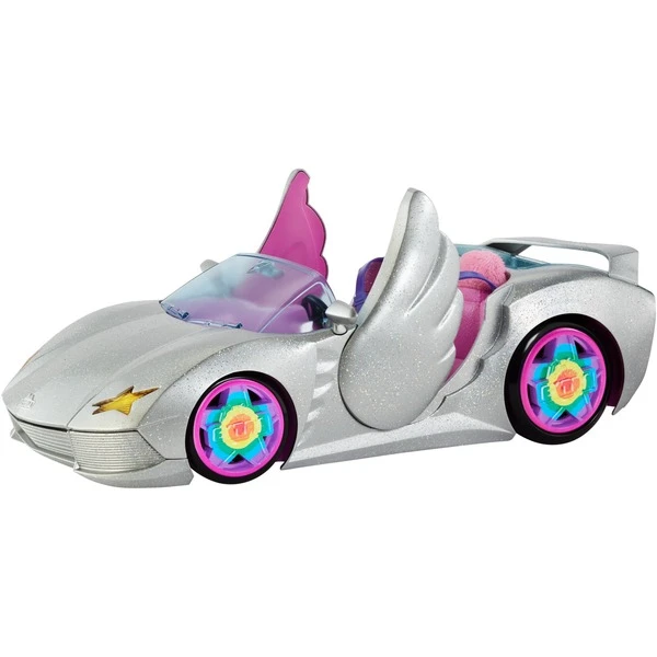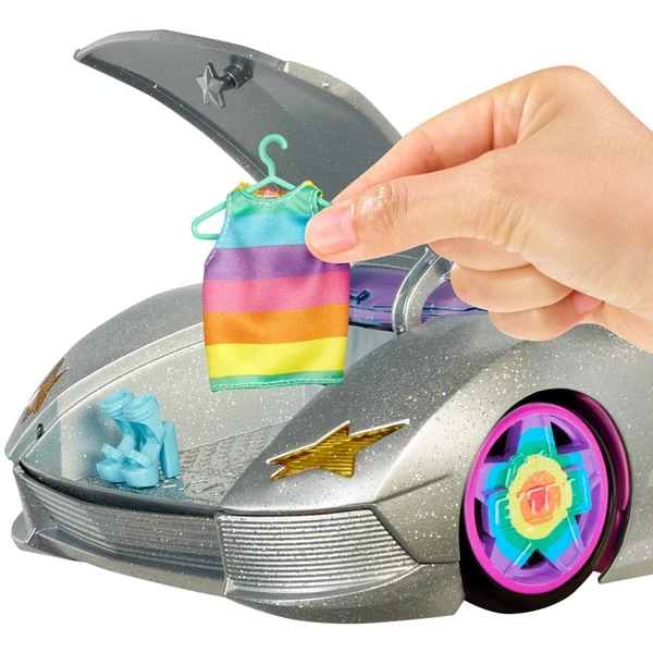 Beim Thema Mode heißt es für die Barbie Extra Puppen „mehr ist mehr“ – und das gilt auch für das Barbie Extra Cabrio! Mit diesem glitzernden Sport-Cabrio in Silber mit zwei Sitzen, rosa Innenausstattung und auffälligen Details wie Regenbogenfelgen, Türen in Flügelform und flauschigen Kopfstützen können Kinder Barbie stilvoll auf Tour schicken. Wenn Barbie ein anderes Outfit braucht – kein Problem: Im Kofferraum ist Platz für ein weiteres Paar Schuhe und ein trendiges Oberteil (beides enthalten). Barbies Hündchen kann mit seinem süßen Schwanen-Schwimmring im Mini-Pool hinten im Auto planschen, bevor es zusammen mit Barbie zu neuen Abenteuern aufbricht. Mit so vielen auffälligen Details und dem witzigen Zubehör verbreitet das Barbie Extra Glitzer-Cabrio EXTRA Stimmung, wo auch immer es auftaucht. Puppen separat erhältlich.Art.-Nr.: 1806314