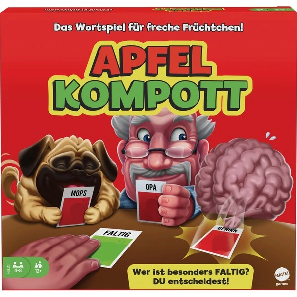 Das Spiel mit den verrückten Kombinationen! Das Apfelkompott Partyspiel kommt in einer Metalldose zum Sammeln und enthält 1000 Karten! Es ist das total verrückte, preisgekrönte Partyspiel, das vier bis zehn Spielern jede Menge Spielspaß bringt! Das Spiel ist so leicht zu lernen, wie Äpfel mit Äpfeln zu vergleichen. Einfach aufmachen, Karten verteilen und schon geht’s los! Jeder Spieler wählt eine seiner Handkarten aus, die seiner Meinung nach am besten zu dem Begriff der vom Schiedsrichter aufgedeckten Karte passt. Der Spieler, für dessen Karte sich der Schiedsrichter entscheidet, gewinnt die Runde. Und das Gute daran? JEDER ist mal Schiedsrichter! Jede Runde ist voll überraschender und total verrückter Vergleiche zwischen Leuten, Orten, Dingen oder Ereignissen. Rasant, wild und erfrischend anders! Apfelkompott ist perfekt für die Familie und den Freundeskreis! Das Partyspiel mit über 1000 Karten kommt in einer Metalldose. Abweichungen in Farbe und Gestaltung vorbehalten.Art.-Nr.: 1657946
