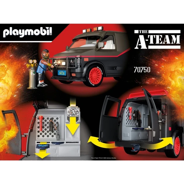 Das A-Team, das sind vier Ex-Elitesoldaten in ungewöhnlicher Mission. Zu Unrecht verurteilt und selbst auf der Flucht vor der Militärpolizei helfen sie anderen Menschen in Not. Also wenn es mal ein Problem gibt, hilft sicher das A-Team. Neben Hannibal, B.A., Face und Murdock ist das fünfte Teammitglied mit Sicherheit der megacoole A-Team Van. Mit seiner umfangreichen Innenausstattung mit Monitor, Schweißgerät, Einsatztafeln, Schrank und Lochwand für verschiedenes Zubehör ist der Van für jeden Spezialeinsatz bestens ausgestattet. Natürlich finden alle Teammitglieder im Inneren des Wagens Platz. Für das leichtere Bespielen können die Dacheinsätze abgenommen werden. Wie das Original hat auch der A-Team Van von Playmobil die ikonische dreifarbige Lackierung, eine verlängerte Sonnenblende und rote Felgen. Ein echtes Highlight nicht nur für Filmautosammler und A-Team-Fans!