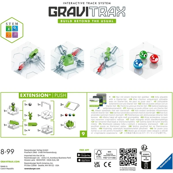 GraviTrax – das innovative Baukastensystem für anspruchsvolle Kugelbahnen. Aus einer Vielzahl an verschiedenen Bausteinen und Schienen lassen sich bei geschickter Nutzung der physikalischen Gesetze aktionsreiche Streckenverläufe planen, ausprobieren und realisieren. Mit den zahlreichen Erweiterungs-Sets wird das freie Bauen und Konstruieren des innovativen Bausystems GraviTrax jedes Mal aufs Neue noch interessanter und spannender! Mehr Möglichkeiten – mehr Spaß! Diese Erweiterung zu einem bereits bestehenden Starter-Set enthält verschiedene Spezialelemente und 3 Kugeln. Das bringt noch mehr Flexibilität in die GraviTrax-Welt!Art.-Nr.: 1913171