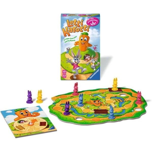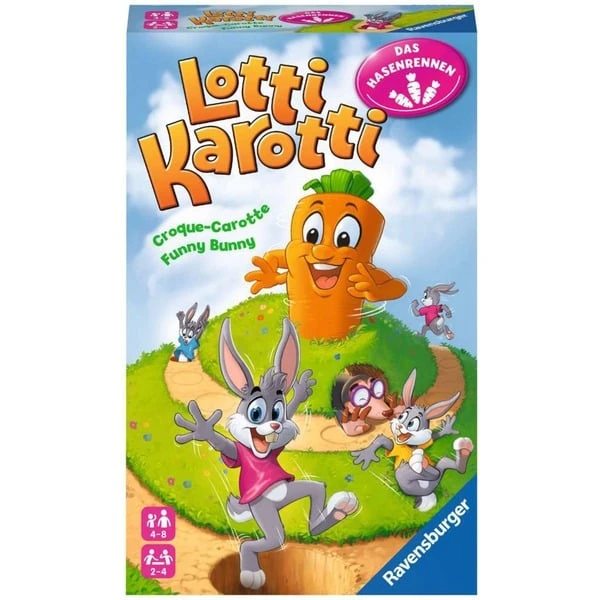 Acht kleine Hasen starten zum spannenden Wettrennen zur Karotte. Wie weit sie hüpfen dürfen, bestimmt das Glücksrad, das die Spieler in jedem Zug drehen: Landen sie bei ihrer Aktion auf einem sicheren Feld oder – hoppla – in einem gefährlichen Loch? Der kleine Maulwurf schubst einen beliebigen Mitspieler ein Feld zurück und wer eine Brücke vor sich liegen hat, darf eine Abkürzung nehmen. Mit einem Brett kann ein offenes Loch wieder begehbar gemacht werden – oder man kann sogar den Weg abkürzen, indem man eine Brücke repariert. So bleibt es spannend bis zum Schluss! Dieses Hasenrennen ist eine lustige Variante von Lotti Karotti, das nicht nur Lotti Karotti-Liebhaber ab 4 Jahren, sondern die ganze Familie begeistert.Art.-Nr.: 1894559