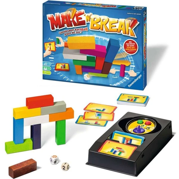 Das Bauspiel des Jahrzehnts ? jetzt komplett neu! Im neuen Make ’n‘ Break baut und punktet ihr gemeinsam. Aber Vorsicht: Gewinnen kann weiterhin nur einer! Über 150 neue, spannende Aufgaben und der brandneue Fun-Würfel mit knifflig-pfiffigen Spielvarianten bieten jede Menge Unterhaltung und noch größeren Spielspaß. Und natürlich könnt ihr auch weiterhin die klassische Variante spielen! Mehr Spaß! Mehr Abwechslung! Mehr Make ’n‘ Break!Art.-Nr.: 1345741