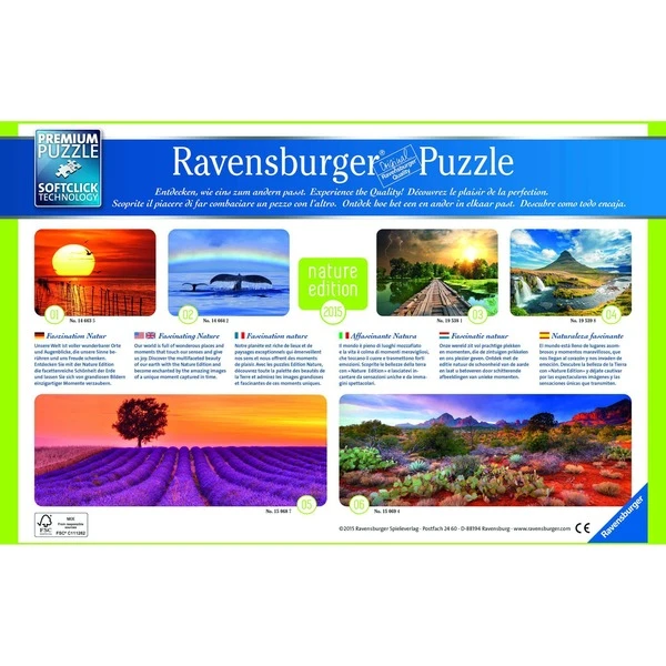 Faszination Natur. Unsere Welt ist voller wunderbarer Orte und Augenblicke, die unsere Sinne berühren und uns Freude schenken. Entdecken Sie mit den Puzzles der Nature Edition die facettenreiche Schönheit der Erde und lassen Sie sich von grandiosen Bildern einzigartiger Momente verzaubern. Mit mehr als 300 Puzzlemotiven für Erwachsene von 300 bis 32.000 Teilen hält das Sortiment von Ravensburger für jeden das richtige Puzzle bereit. Die jahrzehntelange Erfahrung von Ravensburger in der Herstellung von Puzzles ermöglicht nicht nur die beste Auswahl schöner Motive, sie gewährleistet auch die Premiumqualität mit Softclick Technology. Im gesamten Herstellungsprozess stellt Ravensburger höchste Ansprüche an die Materialien und die Verarbeitung. Deshalb sorgen von Hand gezeichnete Stanzvorlagen und Stanzwerkzeuge, die mit Uhrmacherpräzision in Handarbeit gefertigt werden, für größtmögliche Passgenauigkeit und Formenvielfalt der Puzzleteile. Erleben Sie die Ravensburger Leidenschaft für Qualität beim Entdecken, wie eins zum anders passt.Art.-Nr.: 1278398