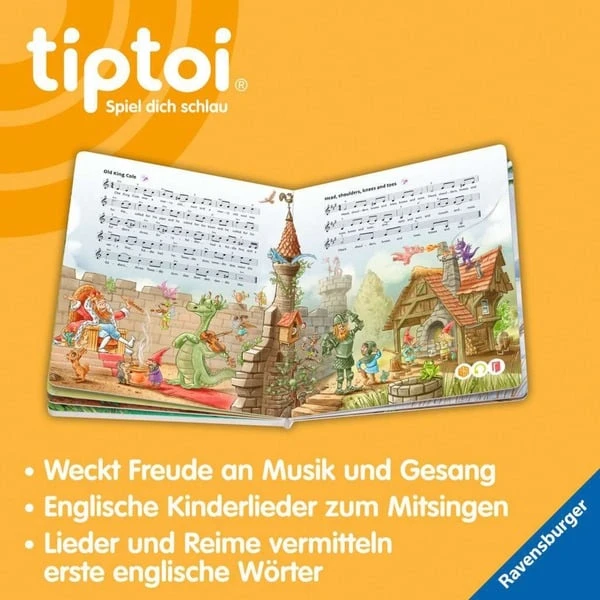 Mit den tiptoi-Liederbüchern macht Singen besonders großen Spaß! Die abgedruckten Lieder können mit Gesang oder in der Instrumentalversion angehört werden. Die Notensätze und Gitarrenakkorde laden zum Musizieren ein. Neben den abgedruckten Liedern sind zahlreiche weitere auf den Bildern versteckt. Dieses Liederbuch lädt die Kleinen dazu ein, englische Kinderlieder anzuhören und mitzusingen. Ganz spielerisch werden sie so an Musik und das Englischlernen herangeführt. Kleine Übersetzer-Wichtel helfen dabei, englische Lieder, Reime und Sätze im Bild zu finden und zu verstehen. Mit dabei: „Itsy bitsy spider“, „Mary had a little lamb“, „Happy birthday to you“, „The wheels on the bus“, „Head, shoulders, knees and toes“, „Twinkle, twinkle, little star“ und vielen weiteren beliebte Lieder.Art.-Nr.: 1895562