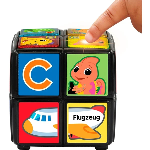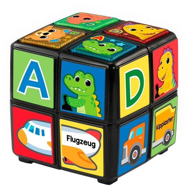 | Inhalt/Ausstattung | Die obere Seite des Würfels lässt sich drehen, so dass die Buchstaben und Tiere mit den Fahrzeugen kombiniert werden können. Der Würfel erkennt die entsprechenden Kombinationen und spielt passende Inhalte und Musik ab. Die 4 leuchtenden Tasten auf der Oberseite des Würfels lösen Inhalte zu den jeweiligen Tieren, Buchstaben, Zahlen und Fahrzeugen aus. 5 gesungene Lieder und 16 Melodien | ||